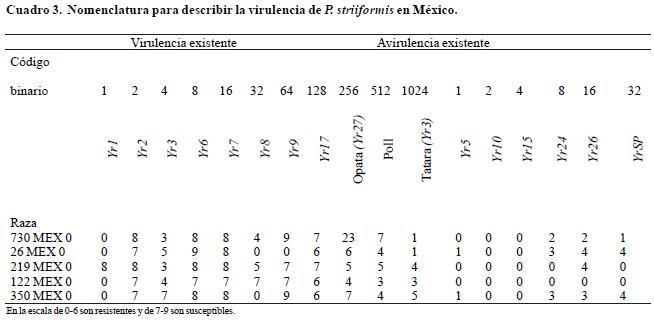 Para la designación de razas fisiológicas de roya amarilla en trigo en México no existe una nomenclatura definida debido a la poca variación existente hasta 2005, y sólo se usaba el número del aislamiento y el año en que fue identificado, además de la fórmula de avirulencia/virulencia de los genes usados como diferenciales; pero en el presente estudio se utiliza una nomenclatura propuesta por Rodríguez et al. (2008). que se muestra en el Cuadro 3.