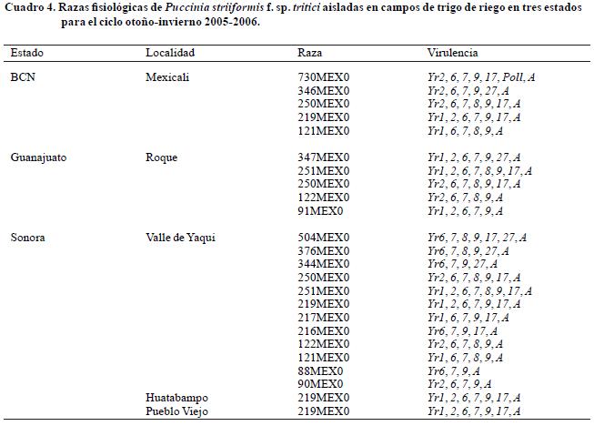 En total, el ciclo de cultivo otoñoinvierno 20052006 se identificaron 16 razas fisiológicas en las diferentes localidades de los estados de Baja California Norte, Sonora y Guanajuato.