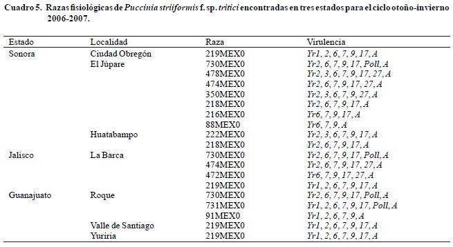 En el ciclo otoñoinvierno 20062007 se identificaron 12 razas fisiológicas en localidades de los estados de Sonora, Jalisco y Guanajuato. Durante este ciclo no se observó virulencia para el gene Yr8 en ninguna localidad muestreada, lo que indica que las razas que se aislaron durante el ciclo otoñoinvierno 20052006 no fueron las mismas que para el ciclo 20062007, a excepción de las que no tenían virulencia para Yr8. En Sonora la virulencia para Yr3 y Poll fue rara, pero sí se detectó mayor virulencia para Yr2, Yr17 y Yr27 principalmente, de las cuatro razas caracterizadas anteriormente se presentaron la 219MEX0 (MEX03.37); 350MEX0 (MEX96.11) y 730MEX0 (MEX02.28) (Cuadro 5). En la única localidad muestreada del estado de Jalisco no se detectó virulencia para Yr3 y Yr8. En Guanajuato no se detectó virulencia para Yr3, Yr8 y Yr27; de las razas detectas anteriormente sólo se identificó 730MEX0 (MEX02.28) que se reportó en 2002, y en total se identificaron cuatro razas en esta entidad.