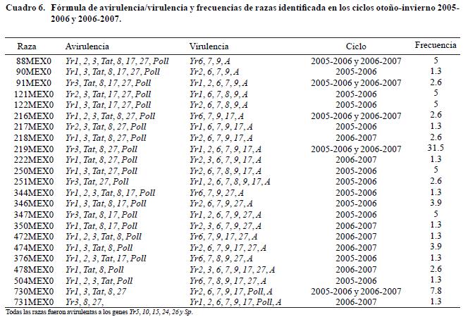 En el Cuadro 6 se enlistan las 23 razas identificadas en los ciclos otoñoinvierno 20052006 y 20062007, su fórmula de avirulencia/virulencia y frecuencia. La raza de mayor frecuencia fue 219MEX0, caracterizada principalmente por infectar al gene Yr1, seguida de 730MEX0 caracterizada por su virulencia para triticales.