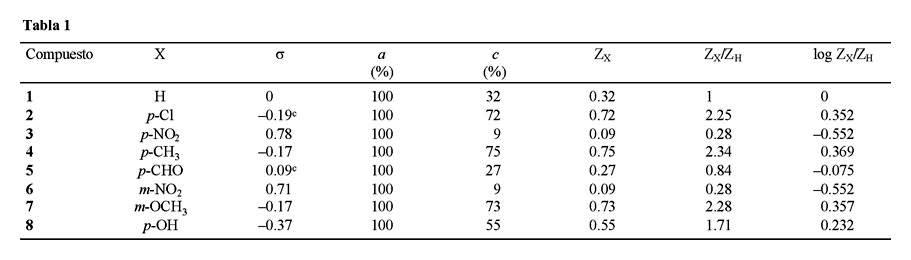 En la Tabla 1 se resumen los valores calculados del log Zx/ZH, así como los valores de la constante σ de Hammett empleados [9]. Al trazar los valores correspondientes, gráfica 1, se encontró una dispersión pequeña no significativa, siendo el factor de correlación de 0.958. En consecuencia, el resultado es indicativo de la existencia de un efecto lineal en la estabilización de a por parte de los sustituyentes en el anillo aromático siendo mayor cuando éstos son electrodonadores.