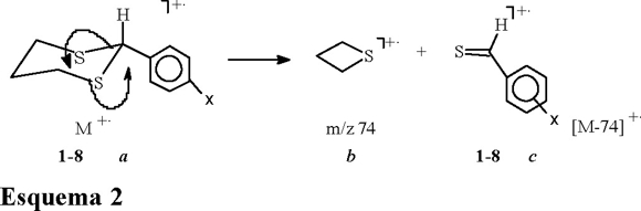 En particular el ion [M-74]+· fue asignado al radical catiónico (c) de un tiocarbonilo, este pico es uno de los más importantes para comprobar el esqueleto base de los ditianos, el cual a su vez estuvo presente en todos los espectros analizados. Su formación se propone como se muestra en el esquema 2, lo cual fue validado por alta resolución así como mediante disociación inducida por colisión-iones entrelazados. Se debe mencionar que este fragmento fue con el que se estableció una correlación de tipo Hammett-McLafferty.