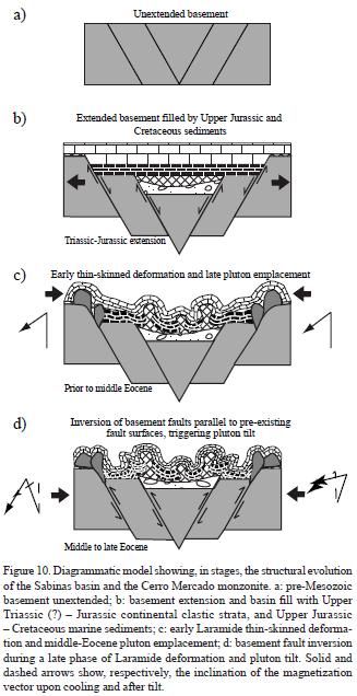 We propose that deformation related to basin inversion provides a more suitable explanation. It has been proposed that fault inversion may occur by two general mechanisms (Buchanan and McClay, 1991): inversion without tilt of basement blocks and inversion with tilt of basement blocks. Both mechanisms produce shear on the fault plane and vertical stress on the overlying sequence, developing drape folds and/or tilt in rigid bodies (Figure 10). In our interpretation, the paleomagnetic discordance and tilt of the Cerro Mercado pluton resulted from rotation about a horizontal axis that in turn was caused by shear along a highangle fault during inversion of basement faults in the southern margin of the Sabinas basin during a late phase of Laramide deformation in the area (Figure 10). We thus propose that normal basement faults formed in TriassicJurassic time assisted in channeling magmatism of the CMB, these same faults were inverted during Laramide time, and may have controlled ductile and brittle deformation present at Cerro Mercado. We thus suggest that the mechanism of inversion of basement blocks is responsible for tilt of the Cerro Mercado pluton.