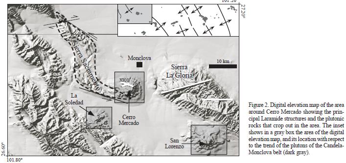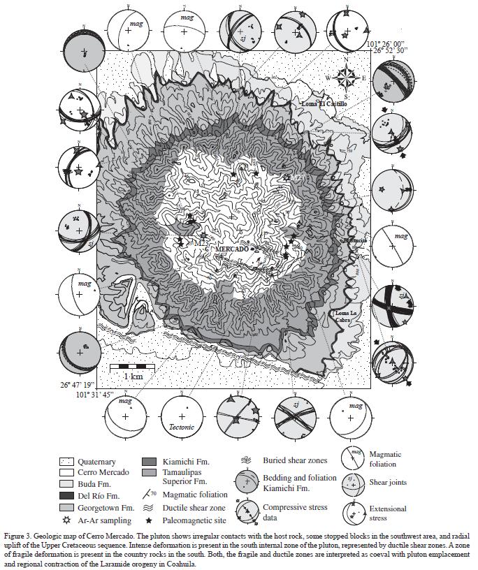 Here we present structural, geochronological, magnetic fabric, and paleomagnetic data for the Cerro Mercado pluton in central Coahuila, northeast Mexico. These data suggest that emplacement of this pluton, which forms part of the CandelaMonclova magmatic belt, is syntectonic with respect to the contractional Larámide orogeny. This interpretation is based on deformation at its margins, magmatic foliation and internal structure, the relationship of emplacement with respect to folding, magnetic fabric patterns, tilt of the pluton, and its age relative to synorogenic sedimentation. We also discuss the implications of this interpretation for the timing of the Larámide orogeny in northeast Mexico.
