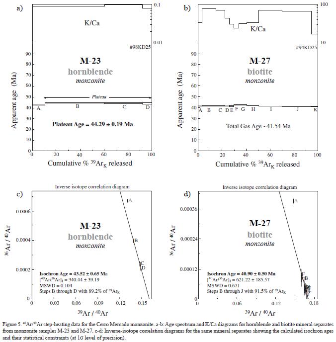 Hornblende and biotite mineral separates from two monzonite samples from Cerro Mercado (M23 and M27; Figure 3) were obtained at the U.S. Geological Survey in Denver for 40Ar/39Ar geochronology studies. The separates ranged in size between 250 and 125 µm, and were obtained using magnetic separation, heavy liquids, and hand picking techniques to a purity of >99%.
