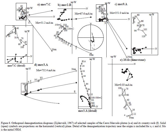 Paleomagnetic data for Cerro Mercado are based on stepwise demagnetization of samples from 11 sites collected throughout the pluton (Figure 3); one additional site was collected in limestone of the host rock. Each paleomagnetic site consists of five to seven individually oriented samples collected within an area of several square meters. The samples were oriented with magnetic and solar compasses, which yielded no systematic differences between orientations.