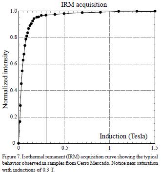 Isothermal remanent acquisition curves (IRM) nearly reach saturation with inductions of 0.3 T (Figure 7). This confirms that a cubic phase is the dominant magnetic mineral. But a small increase in remanence between 0.3 and 1.5 T is attributed to hematite. Thin section inspection of the samples shows that thin oxidation rims are present on some of the magnetite grains. The high unblocking temperatures are more consistent with lowTi magnetite as the main remanence carrier. Liquid nitrogen demagnetization indicates the presence of multidomain (MD) magnetite grains. These results suggest that the magnetic mineralogy consists of large MD magnetite grains, small PSD or SD lowTi magnetite grains of high coercivity, and a small fraction of hematite of secondary origin.