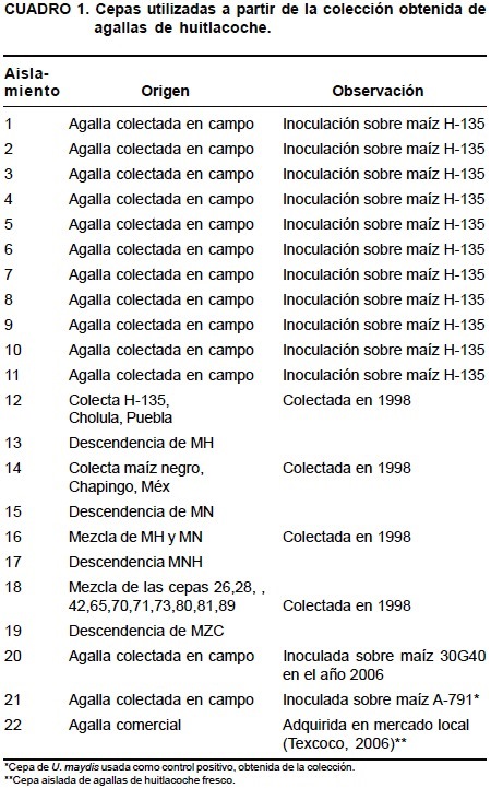 Para la realización del presente estudio, se utilizaron veintiún aislamientos provenientes de una colección de U. maydis aislados de agallas en maíz (huitlacoche) y mantenidos en condiciones de laboratorio. Estos aislamientos habían sido caracterizados previamente con técnicas basadas en PCR (datos no mostrados) y cuyos perfiles de DNA indicaron amplias diferencias entre los organismos que se compararon en su momento, por lo que se dudaba de su origen. Los aislamientos se activaron en cajas Petri con medio de cultivo papa dextrosa agar (PDA) y cloranfenicol a una concentración de 500 ppm durante ocho días a 28 °C (Cuadro 1).