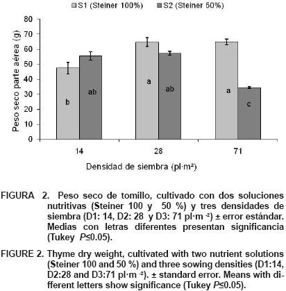 Los dos factores estudiados (densidad, solución y su interacción) ejercieron un efecto significativo (P<0.05) sobre el peso fresco de las plantas (Cuadro 4). No se presentó diferencia estadística en ningún tratamiento (Figura 1); sin embargo, el valor más alto obtenido fue 219.68 g (S1 D2), que supera los 135.5 g reportados por Udagawa (1995). Al cultivarse bajo invernadero en un sistema hidropónico, se pueden obtener al año 18.45 kg·m2 de tomillo fresco (219.68 g x 28 plantas·m2 x 3 ciclos al año), mientras que a campo abierto sólo se obtienen 3.79 kg·m2 al año (135.5 g x 14 plantas·m2 x 2 ciclos al año), ofreciendo este sistema de cultivo un incremento en el rendimiento de peso fresco del 386.8 %, comparado con el rendimiento obtenido en campo. Situación similar se presentó en la variable de peso seco de la parte aérea (Figura 2), ya que los valores más altos correspondieron a los tratamientos S1 D2, S1 D3, S2 D1 y S2 D2 sin diferencias estadísticas; en ambas variables el tratamiento S2 D3 presentó los valores más bajos, debido a la alta competencia por espacio, agua, luz y nutrimentos. El rendimiento de peso seco obtenido en México apenas alcanza las 2.68 t·ha2 anuales (SIAP, 2009), mientras que con este sistema utilizando S1 D2, se incrementa hasta 54.27 t·ha1 (64.61 g x 28 plantas x 3 ciclos al año x 10, 000 m2), que multiplicado por $ 22,992.14, si el producto se exporta (SIAP, 2009), representa una ganancia anual de $ 1,193,940.00; por lo tanto, el cultivo bajo invernadero supera la ganancia económica a la obtenida en cultivos en campo.