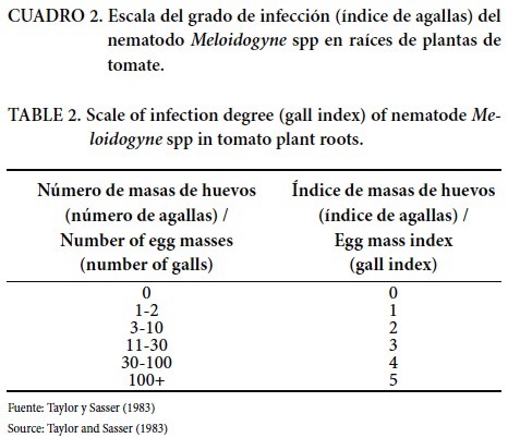 Las plantas inoculadas con nematodos, fueron llevadas a laboratorio donde sus raíces fueron lavadas. Posteriormente se tiñeron las masas de huevos con Phloxina B (0.15 g·litro-1) durante 20 minutos (Barker, 1985) y se cuantificaron mediante el índice de agallas pequeñas (menores de 5 mm) y el índice de agallas grandes (mayores de 5 mm) (Taylor y Sasser, 1983, Cuadro 2).