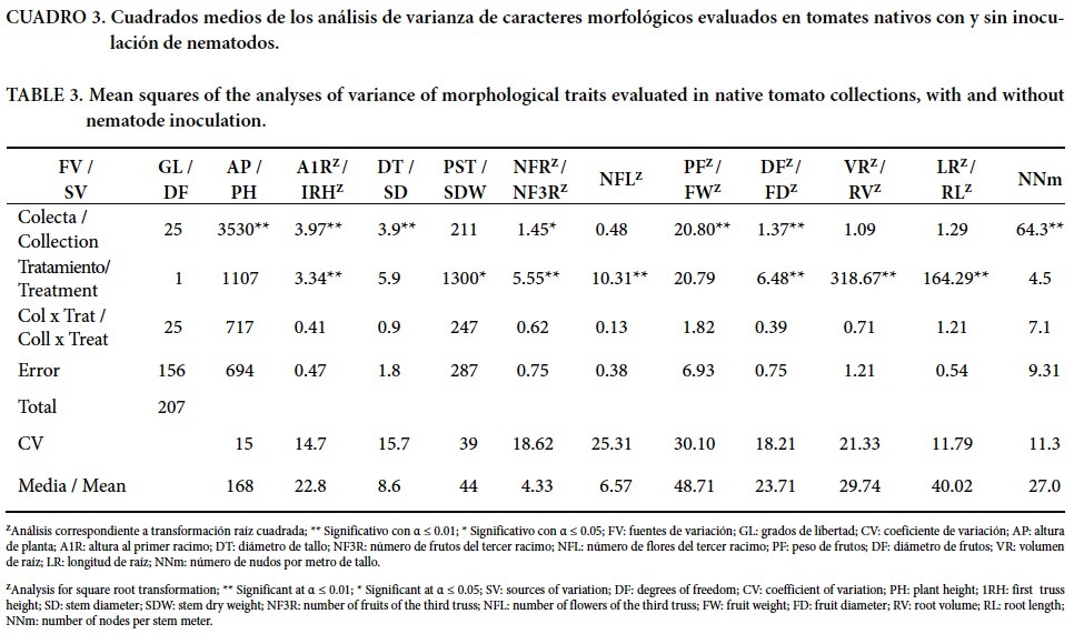 Mediante los análisis de varianza (Cuadro 3) de caracteres morfológicos evaluados tanto en testigos como en tratamientos inoculados, se detectaron diferencias significativas en el factor colectas en altura de planta, altura al primer racimo, diámetro de tallo, peso y diámetro de frutos, y número de nudos en un metro de tallo. La inoculación de Meloidogyne incognita (tratamientos) afectó significativamente la altura al primer racimo, peso seco de tallo, al número de frutos, número de flores, diámetro de frutos, así como volumen y longitud de la raíz. No se detectó significancia en la interacción colecta por tratamiento.