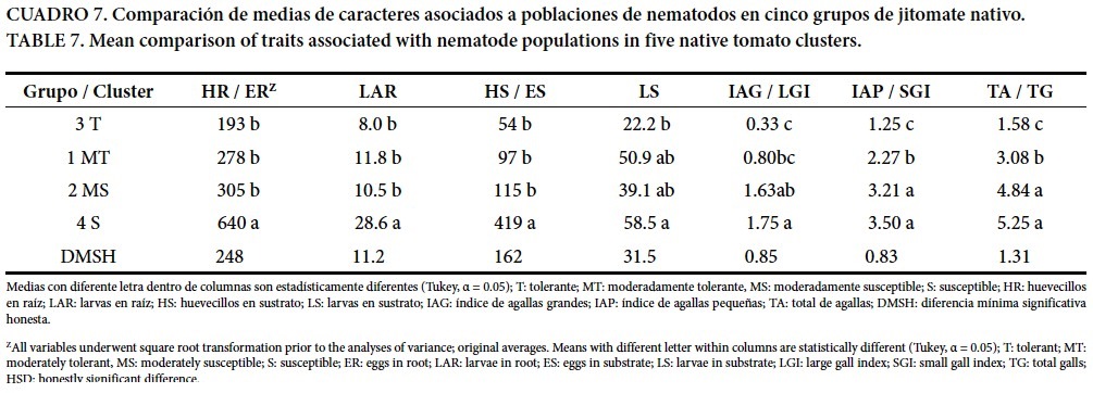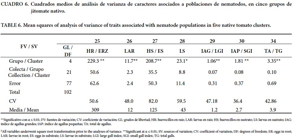 Los índices de agallas (pequeñas, grandes y totales) y la cantidad de huevecillos-larva en raíz y sustrato tuvieron diferencias dentro de los grupos identificados. No se detectó variación entre colectas dentro de grupos.