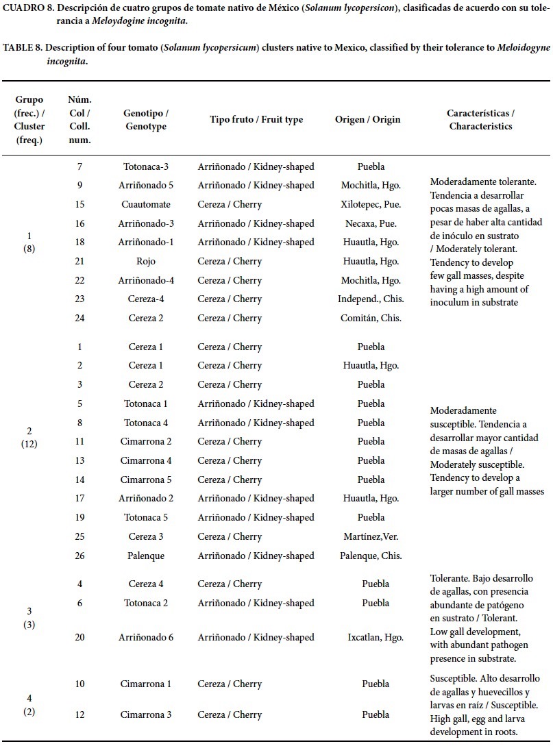 En el Cuadro 8 se presentan las colectas y la descripción de grupos generados por los análisis anteriores. No se detectaron asociaciones entre orígenes o formas de fruto con respecto a la tolerancia a Meloidogyne incognita.