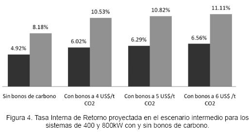 Al integrar al análisis financiero la posibilidad de obtener los bonos del mercado voluntario, correspondientes a la sustituciones estimadas de combustibles fósiles, se contemplaron escenarios para las capacidades mayores, (400 y 800) kw, por ser estas las que presentaron mejores perspectivas económicas (Figura 4). El impacto de los bonos se reflejó en incrementos en la TIR de 1,1% a 1,6% en el sistema de 400 kw y de 2,3% a 2,9% en el de 800 kw. Como puede apreciarse, en este último los bonos de carbono, en los tres niveles de precio considerados, incrementaron la TIR por arriba de 10%, establecido como la TREMA para el análisis. Debido a esto, un proyecto de generación de electricidad con biomasa, bajo las condiciones descritas en este estudio, cumpliría con el criterio de adicionalidad que se requiere en los Mecanismos de Desarrollo Limpio. Capacidades de 400 kw o menores requerirían contar, además de ingresos por bonos de carbono, de subsidios especiales, si su implementación es de carácter estratégico.