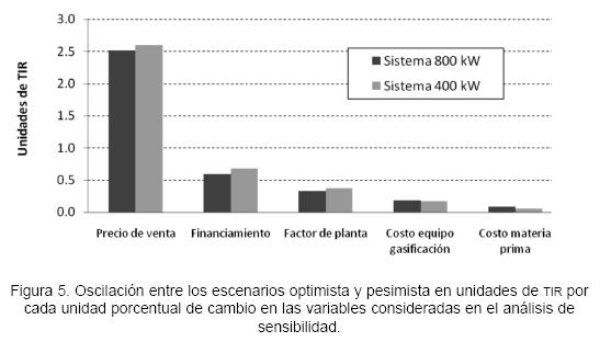 La figura 5 muestra el efecto del cambio observado en la TIR por la variación en una unidad porcentual en las variables consideradas en los escenarios propuestos en este estudio. La variable más sensible fue sin duda el precio de venta; una variación de ± 1% resultó con una oscilación de la TIR en 2,5 unidades porcentuales. Junto al precio de venta, las variables financiamiento y factor de planta son el grupo de variables con un segundo efecto más importante en la TIR. El costo de la materia prima mostró la menor sensibilidad de las cinco variables con alrededor de 0,1% de cambio por cada unidad porcentual de cambio.
