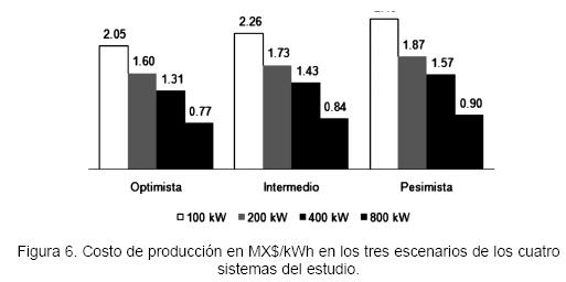 Aunque en gran medida el contexto socioeconómico es un factor determinante de los costos de producción, este indicador permite comparar en qué medida la generación independiente de electricidad puede competir con otras fuentes de energía eléctrica. Los valores absolutos de los costos disminuyeron al incrementar las capacidades de los sistemas configurados. En cada uno de los tres escenarios simulados, los costos de la energía de la capacidad más baja (100 kw) fueron alrededor de 2,7 veces mayores que los de la más alta (800 kw) (Figura 6). Junginger et al. (2006), analizaron curvas de aprendizaje en plantas de cama fluidizada a nivel mundial y concluyeron que la economía de escala era el factor que mejor explicaba las reducciones de costos; los costos de electricidad disminuían entre 8% y 9% por cada duplicación de la producción de electricidad.