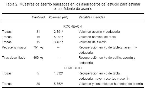 El coeficiente de asierre se estimó con base en muestras parciales, no estandarizadas, de trozas de diferentes diámetros en el asierre primario y de pedacería en secundarios como se muestra en la tabla 2. Los valores obtenidos se validaron por comparación con los de la literatura especializada.