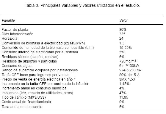 Los principales supuestos técnicos del sistema para el análisis económico se presentan en la tabla 3. La tecnología propuesta a utilizar es la gasificación de biomasa, con gasificador de tipo cama fija y flujo hacia abajo (fixed bed downdraft).