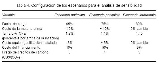 Se evaluó la sensibilidad de la TIR de las cuatro capacidades de sistema (100 kw, 200 kw, 400 kw y 800 kw) a la modificación de cinco variables principales; el análisis de sensibilidad contempló tres escenarios: base, optimista y pesimista (Tabla 4). Adicionalmente, se integró el efecto de los posibles ingresos adicionales por venta de bonos de carbono a tres valores, (4, 5 y 6) US$/tCO2.