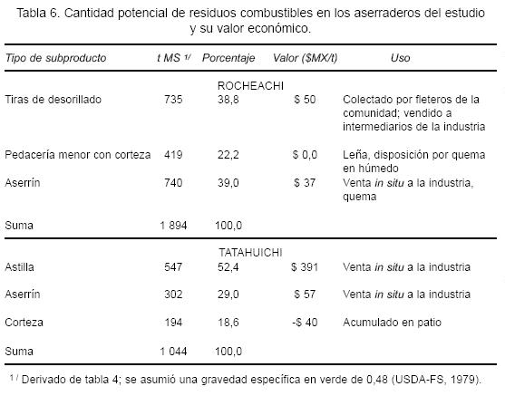 La tabla 6 muestra una comparación entre los aserraderos del estudio en cuanto al uso y valor de sus residuos. Mientras que en Rocheachi, estos se quemaban, se regalaban o se vendían a muy bajo precio, en Tatahuichi se obtenían beneficios económicos importantes. Desde hace dos años, este último ha estado descortezando las trozas y otros residuos y comercializando astilla y aserrín libres de corteza. Estos subproductos equivalen a 35% del volumen de trocería que ingresa a sus patios (Tabla 6). Se estimó que en el 2007, la venta de estos subproductos a la empresa Duraplay en Parral, Chihuahua, aportó a este aserradero arriba de 10% de sus ingresos totales. La demanda de residuos, particularmente descortezados, por parte de la industria de los tableros, ha abierto un mercado en esta zona del estado, lo que ha incrementado el valor de los residuos del aserradero considerados con potencial bioenergético. Por otro lado, en Tatahuichi no se tiene aún una forma de darle valor a la corteza, y su acumulación dispersa en los patios del aserradero resulta en un valor negativo; la maniobra para distribuirla en las zonas arboladas colindantes se estimó en $40/t ms (Tabla 6).