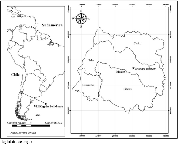Área de estudio. El estudio se realizó en la precordillera de los Andes de la Región del Maule (35° 33’ 41’’ latitud Sur; 71° 10’ 41’’ longitud Oeste; altitud promedio de 1300 m snm), en un área de 2 ha (Fig. 1). El clima de la zona es templado cálido con lluvias invernales (Csb), según la clasificación de Köppen-Geiger (Merkel, 2018). La zona registra precipitaciones totales en torno a 1168 mm al año y, en el mes más seco (enero), puede llegar a registrar solo 14 mm. La temperatura oscila entre 18,5 °C y 5,4 °C que ocurren en los meses de enero y julio respectivamente.
