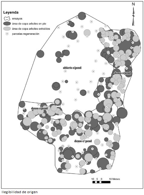 Al momento de la evaluación de la regeneración el año 2015, se determinó la posición relativa de cada árbol y cada tocón de los individuos extraídos a partir de coordenadas azimut (ángulo, distancia). A cada árbol le fue medido su diámetro a la altura del pecho (DAP) y cuatro radios de copa. Las mismas variables fueron medidas antes de la corta de protección en el año 2011. Así, fue posible determinar la condición inicial (2011) y la del bosque residual (2015).
