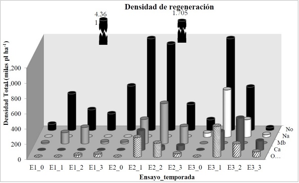 Figura 5 Representación de la regeneración según densidad, especie y temporada en la que se encuentran, para cada ensayo.
