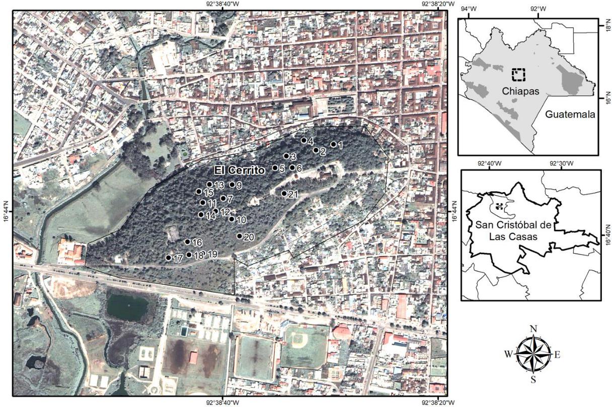 El Cerrito is a promontory located in the central part of the valley of San Cristóbal de las Casas, Chiapas, seeming like an "island" of tree vegetation surrounded by human settlements and roads (Ruiz-Montoya, 2014). Its altitude ranges from 2128 m to 2190 m above sea level, stretching across 80 hectares approximately. It is located between 16°43'54.72"-16°44'08.38" N and 92°38'52.59"-92°38'24.52" E (Fig. 1).