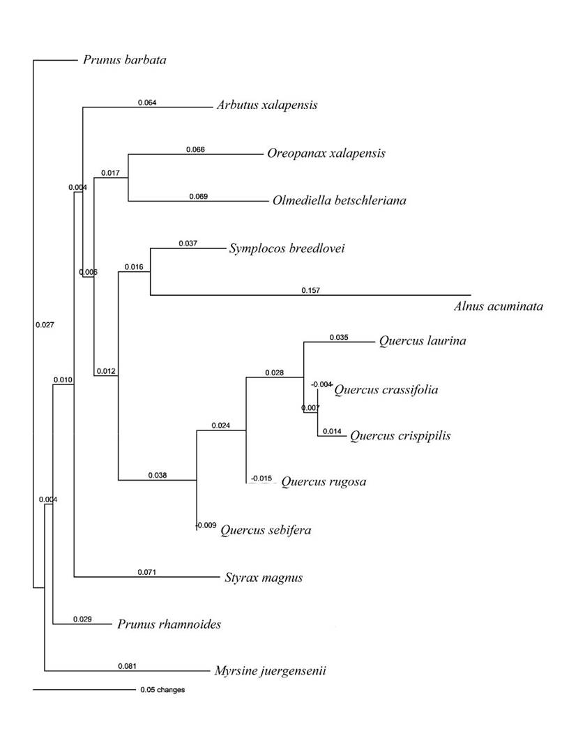 The analysis of molecular variance (AMOVA) showed that 67.21% of variation was found between species and 32.79% within species, with a fixation index Fst = 0.67, P = 0.001. The tree of genetic distances showed a clear grouping only for Quercus species, with Q. crassifolia and Q. crispipilis as the closest species. A genetic relationship was also found between Oreopanax xalapensis and Olmediella betschleriana, as well as between Symplocos breedlovei and Alnus acuminata. Prunus barbata was identified as the basal species (Fig. 2).