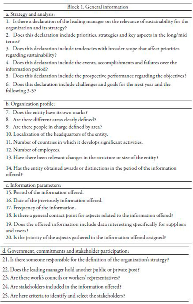 In the sphere of sustainability reports, as we have underscored in the previous section, guides issued by GRI are the main references at global level (Lodhia et al., 2012). Thus, our work considers the indicators proposed in G3 and the supplements for public entities (GRI, 2005, 2006, 2010). This option, additionally, supposes adopting the stance of triple bottom line of Elkington (1998). However, we might contemplate the use of other guides (OCDE, 2006; Banco Mundial, 2008; AccountAbility, 2008a and 2008b; Pacto Mundial de Naciones Unidas, 2009), we believe that focusing on the GRI guides will produce more objective, impartial and neutral empirical results than if we decide to select items from various guides.