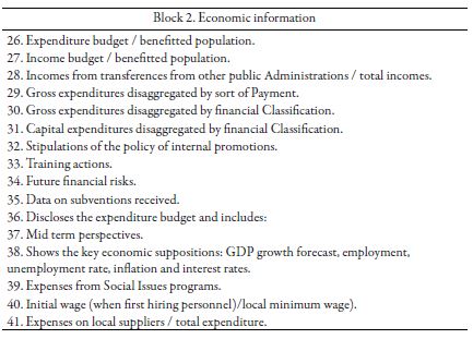 However, as a set, the dissemination level in the web sites is not very high. In particular, it is noticeable that the economic block does not have a higher dissemination level, as it is the one with the best and most developed information systems, as there exists a legal requirement to disseminate the main economic-budgetary aspects. In any case, we did corroborate that the demanded information is disseminated in all of the cases, being the items related to other economic aspects, such as personnel or suppliers, those which are not disseminated.