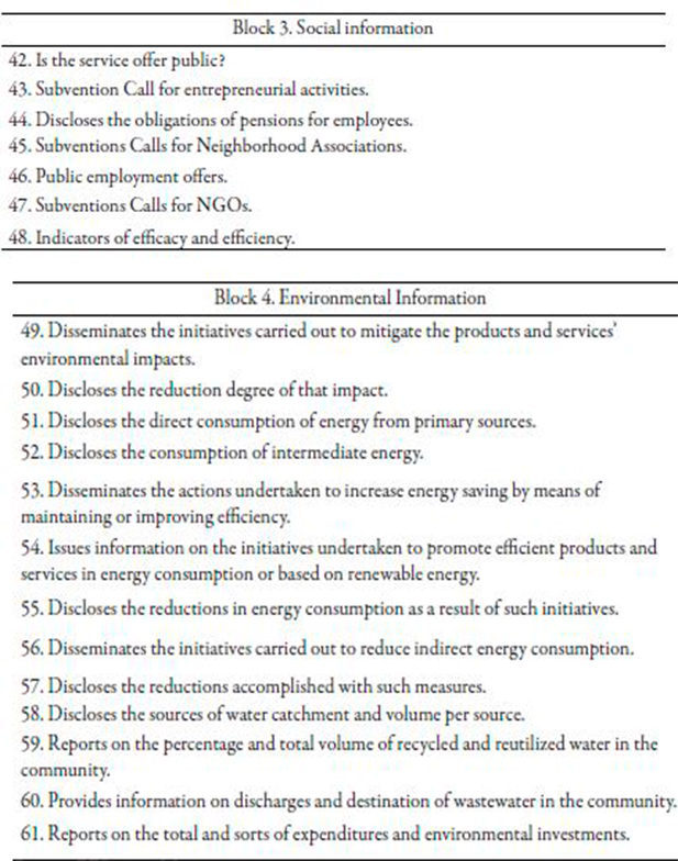 This way, we analyze the information dissemination using a 61-item listing2 divided into seven sections, which we can group in four blocks: a) general information (items 1 - 25), which comprehends information on strategy, organization profile, characteristics of the information disclosed and government, commitments and participation of stakeholders; b) economic information (items 26 - 34); c) social information (items 42 - 48); d) environmental information (items 49 - 61).