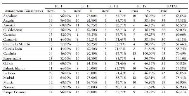 In Table 1 3 data obtained for each AC in each of the analyzed blocks is displayed. From these data, we notice that Spanish ACs as a whole disseminate 61.23% of the information in the GRI item listing, even if there is important variability between the government that disseminated the most 75.41% (Madrid) and the least with 49.18% (Cantabria).