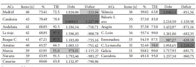 For the analysis of the financial situation of ACs we have official data on debt and deficit published by IGAE. As for the second comparison, we will use the results published by Transparencia Internacional España (TIE, 2013), NGO that works promoting transparency and accountability, assessing various public institutions, among which one finds Regional Governments.
