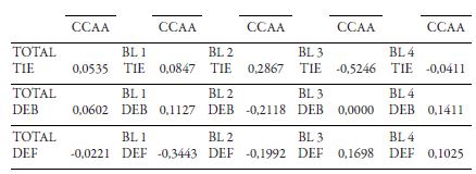 As noticed in table 3, except for the indexes referred to social and general information, the rest has a value under 0.3, therefore, relation is low or null. This way, the information disclosed by ACs presents a moderate-strong negative (r= - 0.5246) relation between the percentage of social information dissemination and TIE index, and an also negative (r= -0.3443) moderate-low relation between general information dissemination and per capita deficit. On the other side, per capita debt does not seem to influence the dissemination level of information on sustainability by ACs.