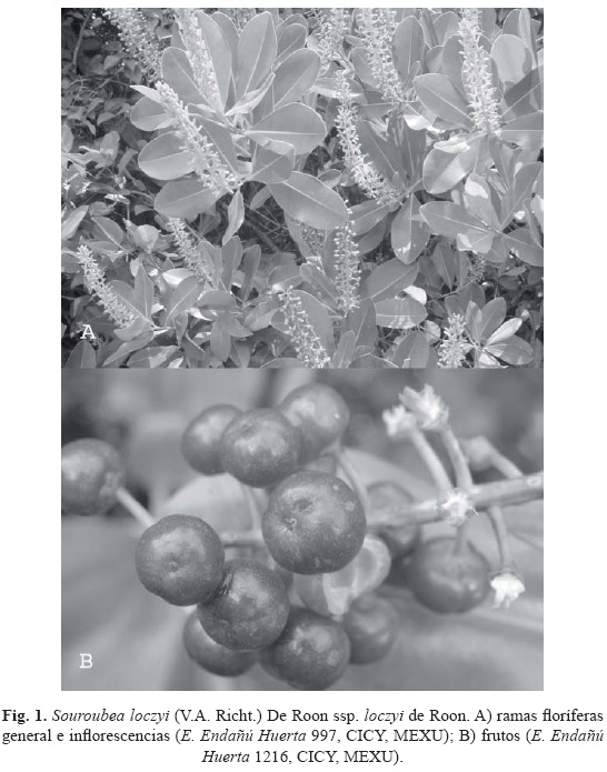 En México existen dos especies de Souroubea Aubl.; S. exauriculata Delpino (Chiapas, Tabasco y Veracruz) y S. loczyi. La primera especie se caracteriza por sus flores con cinco pétalos, estambres y líneas estigmáticas y las inflorescencias generalmente puberulentas mientras que S. loczyi tiene flores con tres pétalos, estambres, líneas estigmáticas y las inflorescencia glabras (Utley, 1984). Los especímenes de Campeche claramente corresponden a la segunda especie. Basado en el largo del pedicelo (0.5-0.9 mm) y del nectario (0.50.6 mm) el material de la región es asignado en la subespecie típica (Utley, 1984). Una tercera especie, S. guianensis Aubl., citada a partir de la colección, Alush Shilom Ton 120 (CAS), en la flora de Chiapas (Breedlove, 1986), es una determinación incorrecta, ya que la especie sólo se encuentra en Sudamérica.
