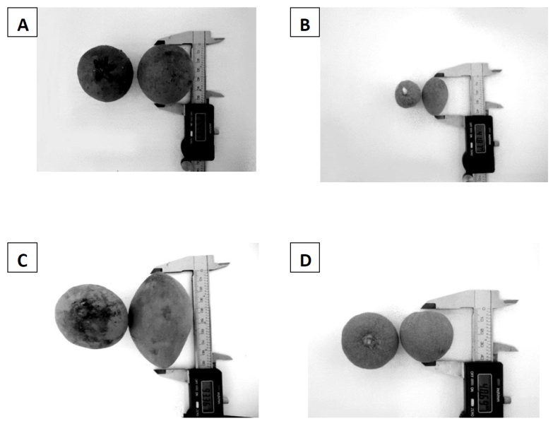 Fig. 1 Diversidad de forma y tamaño en frutos de chicozapote recolectados en Nayarit: fruto de forma redonda (A); fruto de forma alargada y tamaño pequeño (41.87 mm) (B); fruto de forma alargada de tamaño grande (93.36 mm) (C); y, fruto con diámetro ecuatorial mayor que el diámetro polar (D).