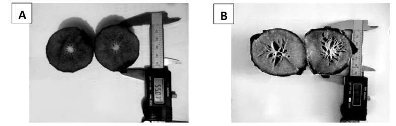 El número de semillas por fruto se presenta en el Cuadro 5. El mayor número lo presentó la recolecta 23 (6.70 semillas por fruto), tres recolectas presentaron frutos sin semilla (Fig. 2), 22 presentaron valores menores a uno, lo que significa que pocos frutos de la muestra tenían semillas; y sólo 22 recolectas tuvieron frutos que siempre presentaron semillas. Los datos de largo, ancho y grosor de la semilla se presentan en el Cuadro 5.