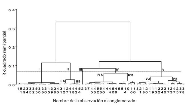 Al realizar el análisis de conglomerados jerárquicos se identificaron cinco grupos a una distancia euclidiana de 0.08 (Fig. 4).