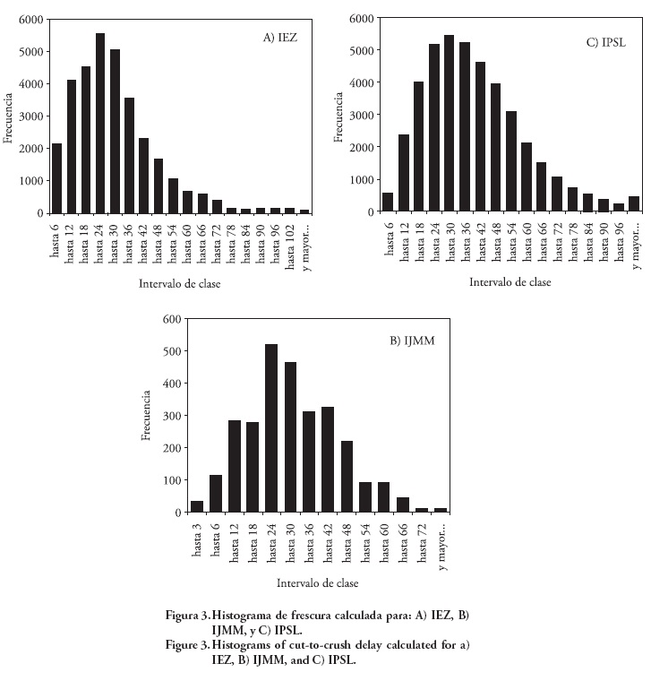 En la Figura 2 se observa la desproporcionada frecuencia de frescuras en el intervalo de clase de 0 a 6 h; más exactamente de la frescura de 6 h, de la cual se identificaron 6869 datos registrados. Sería muy difícil explicar esta anomalía como una simple fluctuación aleatoria. En la Figura 3C se presenta el histograma construido con datos de frescura calculada en este estudio, como la diferencia de dos fechas, donde puede verse una distribución más regular de datos. Dado que se trata de un dato fundamental para este estudio, en la Figura 3 se han incluido también los histogramas de los otros dos ingenios. Puede verse que en el IPSL los nuevos datos se ajustan mejor a una distribución estadística tipo gama.