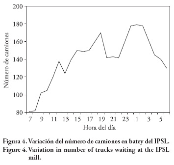3) Para cuantificar el número de camiones en espera afuera o dentro del batey se realizó un conteo horario del número de camiones en espera durante una semana en abril del 2008. Los resultados de este conteo para el IPSL, que cuenta con el mayor número de vehículos, se presentan en la Figura 4. Resultados análogos se obtuvieron para los otros ingenios, como se comenta a continuación.