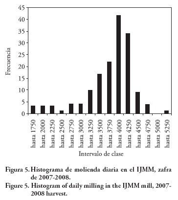 El IJMM reporta una capacidad de molienda de 4000 t d-1, mientras que la molienda diaria promedio fue 3653.9 t d-1. Sin embargo en el histograma de molienda diaria se observa que en 30 % de los días se molió más caña que la capacidad nominal del ingenio, aunque algunos días se muele menos caña que dicha capacidad. Estos datos muestran el carácter aleatorio de la variable molienda diaria. De acuerdo con información publicada por la Unión Nacional de Cañeros, A. C., CNPR (2011) en las 10 zafras de 2000/01 a 2009/10, en el IJMM en promedio se perdió 15.6 % de los días de zafra (mínimo 6.64 % en 2007/08 y máximo 24.69 % en 2000/01). Este tiempo perdido se atribuye a factores de fábrica, personal, días festivos, campo y lluvias.