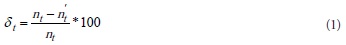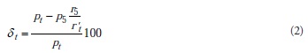 Al considerar en la ecuación (1) la relación entre los radios de las ruedas del tractor sin carga, con carga y de la quinta rueda (rt', rt y r5), en m, las revoluciones de las ruedas, incluyendo la quita rue da (nS), en s-1, y que el encoder del sensor de revoluciones da 100 pulsos s- 1, el patinaje se calculó con la ecuación 2: