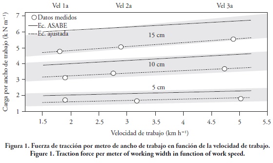 Con las mediciones en campo de la carga aplicada en función de la velocidad de trabajo, en tres niveles de profundidad de trabajo y en tres posiciones de la transmisión, se ajustó el modelo de ASABE (EP 496.3, 2006) para el valor mínimo del cuadrado medio del error de 0.0492, y se obtuvo la siguiente ecuación: FT = (289,3 + 16.7 υ + 0.001 υ2)*b*h/1000, que puede predecir las fuerzas de tracción en campo con desviaciones de hasta ± 4.79 % en los tres niveles de carga evaluados.