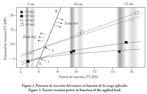 Al incrementar la carga, el patinaje de las ruedas traseras llegan a ser iguales en los dos esquemas de tracción (puntos 1 y 3), y al aumentar aún más la carga, los patinajes de las ruedas traseras fueron menores hasta 45 % en el esquema 4x4, comparados con el esquema 4x2 (para: FT=16 kN, V1 y h=15 cm δt 4x4 = 13 % y δt 4x2=20 %). La frontera de desconexión de la tracción delantera se definió por la ecuación, δt=1.9 FT-4.5, en la cual el tractor presentó los mismos patinajes de las ruedas en los dos esquemas de tracción para las diferentes posiciones de velocidad (línea AB).