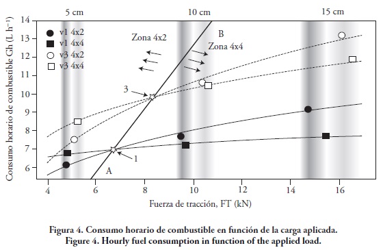 La frontera de desconexión de la tracción delantera fue definida por la ecuación: Gh=1.75 FT-4.7, en la cual el tractor consumió la misma cantidad de combustible en los dos esquemas de tracción, para las diferentes posiciones de velocidad. En este caso, para la carga de 4 kN y la 1a velocidad, el consumo horario de combustible fue mayor en 14 % en el esquema de tracción 4x4 que en 4x2, y para la carga de 16 kN y la 1a velocidad el consumo de combustible fue mayor en 16 % en el esquema de tracción 4x2. IDAE (2005) reportó un cambio de consumo de combustible que varió de 5 a 10 %.