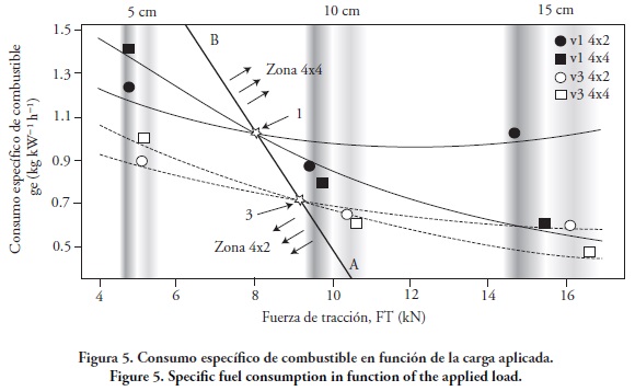 En la Figura 5 se presentan los valores del consumo específico de combustible del tractor calculados con la ecuación (6), y fue superior a 480 g kW-1 h-1 (rendimiento muy bajo de combustible), lo cual fue atribuido a que el régimen del motor bajó notablemente durante el trabajo en carga en la mayoría de los casos, lo cual concuerda con lo señalado por Pérez (2006b). Al aumentar la profundidad de trabajo el consumo específico de combustible disminuyó en los dos esquemas de tracción, pero en mayor grado en el esquema 4x4 debido a los valores mayores de potencia de tracción, comparados con el esquema 4x2. La frontera de desconexión de la tracción delantera está definida por la línea AB, obtenida con la ecuación ge=-0.26 * FT + 3.13, en la que el tractor presentó la misma eficiencia del combustible en los dos esquemas de tracción, para las diferentes posiciones de velocidad.