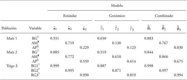 The results from Population 3 are explained because the accuracy of the standard model (Equation 12) is very high (Table 1) due to the grain yield coming from an autogamous species. Therefore, although the number of MM is large, these contribute very little to the accuracy of the combined model.