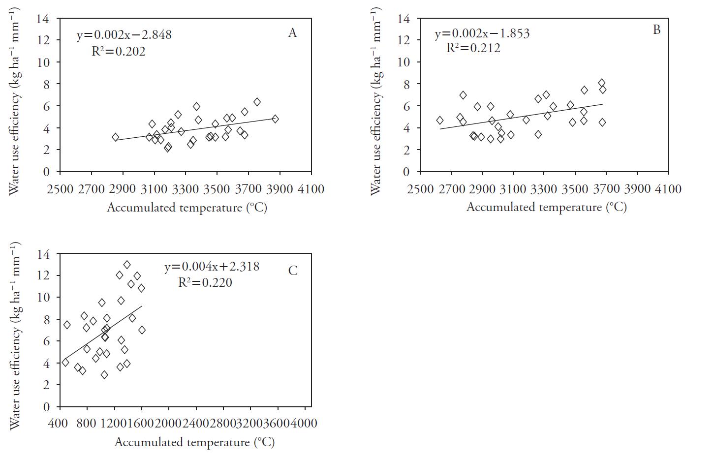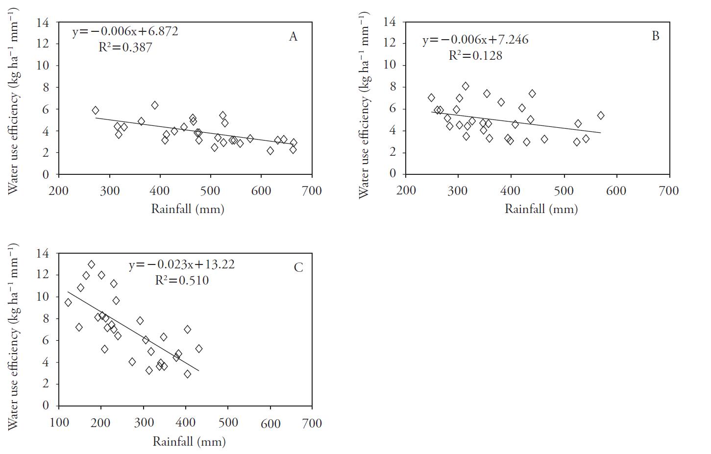 Figura 4 Efecto de la precipitación en la eficiencia en el uso del agua de mijo: (A) Pingliang, (B) Yulin y (C) Huhehot, China.