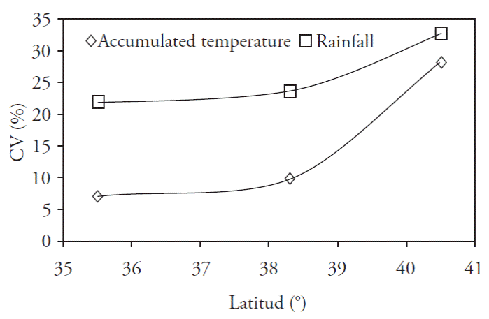 El calentamiento global es un hecho en el mundo (Agnes et al., 2016). La temperatura ha cambiado y afectado significativamente la producción de los cultivos (He et al., 2015). La agricultura es uno de los sectores económicos que dependen más del clima (Hansen, 2002), en especial en las regiones de secano. En nuestro estudio, Huhehot, una región con latitud alta (N 40° 51’), tuvo CV alto en la temperatura acumulada y la precipitaciones (Figura 5). Esto indica que el calentamiento global y la reducción de la precipitación tuvieron una alteración severa en regiones áridas y semiáridas de latitudes altas en China, lo cual coincide con los hallazgos de Ding (2007).